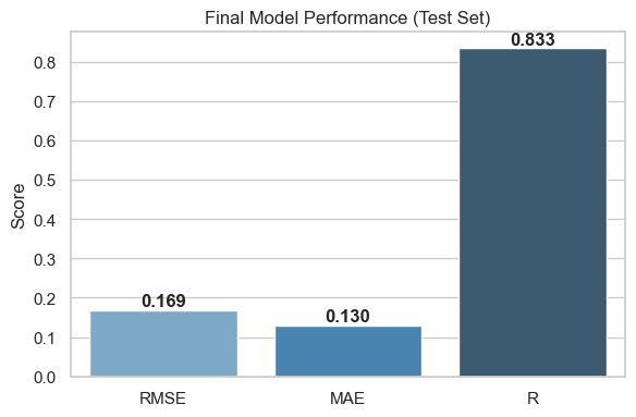 - Test results (log scale): RMSE 0.169, MAE 0.130, R² 0.833.