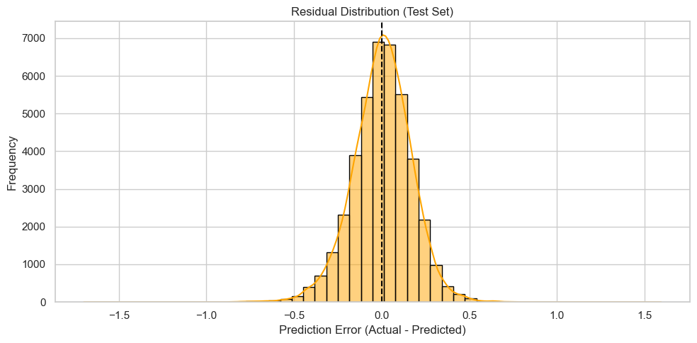 # Create export folder if it doesn't existos.makedirs("exports", exist_ok=True)# Save the final trained modeljoblib.dump(final_model, "exports/xgb_final_model.joblib")# Save processed test setX_test.to_csv("exports/X_test_processed.csv", index=False)y_test.to_csv("exports/y_test_processed.csv", index=False)# Save test predictionspd.DataFrame({"Actual": y_test,"Predicted": final_preds}).to_csv("exports/test_predictions.csv", index=False)print("Artifacts exported to 'exports/' folder.")