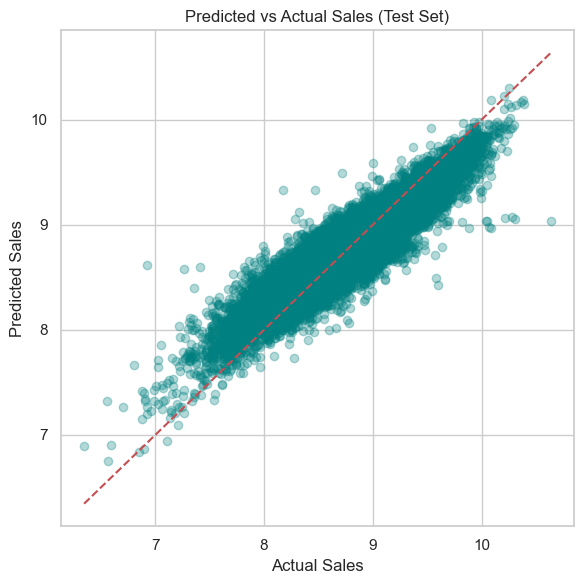 # Build a single test-evaluation file for Tableaudf_test_eval = df_test[['Date','Store','Promo','IsSchoolHoliday','StoreType','Assortment','CompetitionDistance']].copy()df_test_eval['Actual_log'] = y_test.valuesdf_test_eval['Pred_log'] = final_preds# Convert back to original sales units (inverse of log1p)df_test_eval['Actual'] = np.expm1(df_test_eval['Actual_log'])df_test_eval['Predicted'] = np.expm1(df_test_eval['Pred_log'])df_test_eval.to_csv('exports/test_eval_full.csv', index=False)