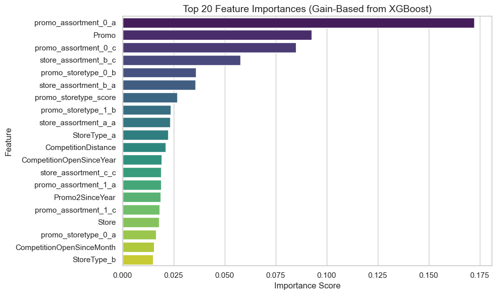 Temporal factors like Day of Week and Promo2 start timing had moderate influence, hinting at seasonal and operational effects.