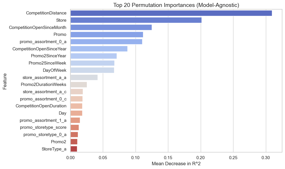 Permutation Importance: CompetitionDistance and Store ID ranked highest in model-agnostic tests