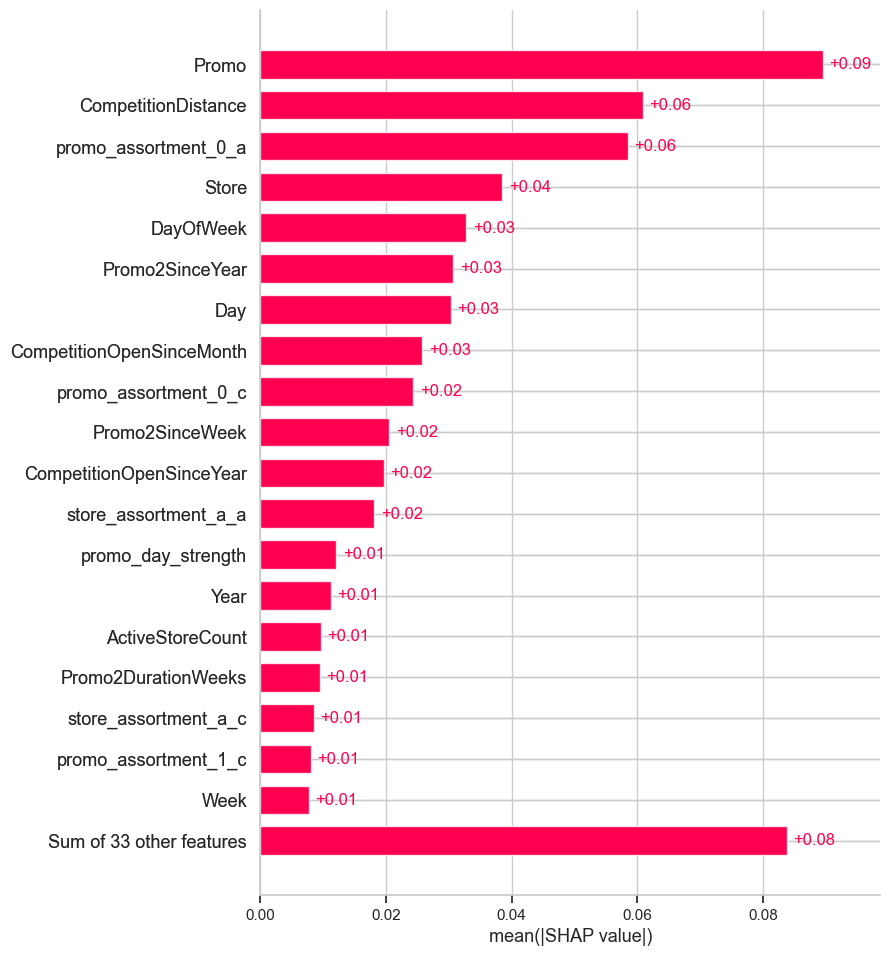 (Promo2SinceYear, Promo2SinceWeek) and competition timing (CompetitionOpenSinceMonth/Year) exhibit smaller but consistent effects. ### Lower-ranked features still contribute marginally: