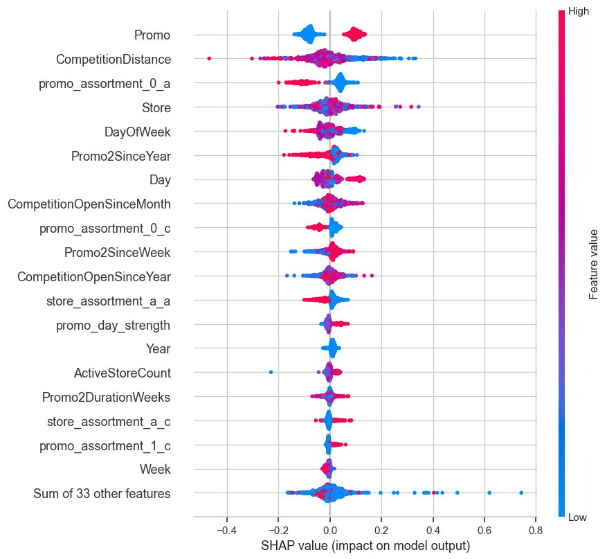 Variables like Promo2, Week, and Promo2DurationWeeks register low SHAP values, indicating limited but not negligible influence.