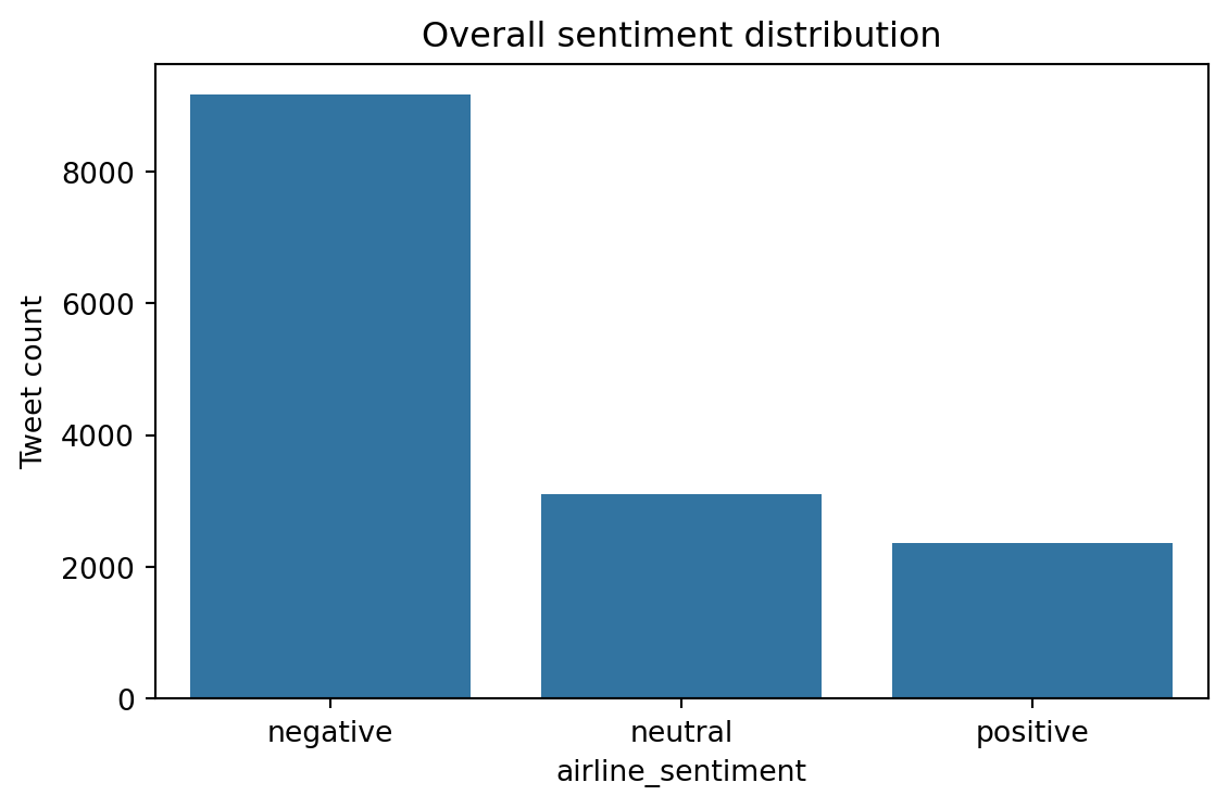 This notebook provides our first look into the Twitter US Airline Sentiment dataset (≈ 14 600 tweets, February 2015) and generates two baseline visualizations that will inform subsequent data‑preparation and modeling work.