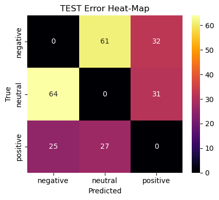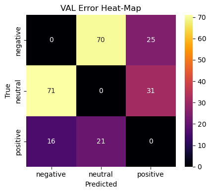 def error_heatmap(m: dict, split: str) ->None:"""Show off‑diagonal misclassification counts for a split.""" y_true, y_pred, _ = _get_arrays(m, split) # <- unified accessor n =len(INT2STR) err = np.zeros((n, n), dtype=int)for t, p inzip(y_true, y_pred):if t != p: err[t, p] +=1 fig, ax = plt.subplots(figsize=(4.5, 4)) sns.heatmap( err, annot=True, fmt="d", cmap="inferno", xticklabels=[INT2STR[i] for i inrange(n)], yticklabels=[INT2STR[i] for i inrange(n)], ax=ax, ) ax.set_xlabel("Predicted") ax.set_ylabel("True") ax.set_title(f"{split.upper()} Error Heat‑Map") plt.tight_layout() plt.savefig(FIGS_DIR /f"error_heat_{split}.png", dpi=150) plt.show()# Call it like this (no direct dict indexing):error_heatmap(metrics, "val")error_heatmap(metrics, "test")