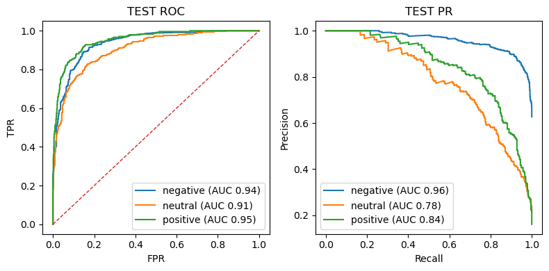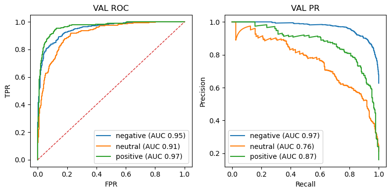 metrics_path = REPORTS_DIR /"metrics_model.json"if"metrics"notinglobals() ornotisinstance(metrics, dict): metrics = json.loads(metrics_path.read_text())def _get_arrays(m: dict, split: str):""" Return (y_true:int[N], y_pred:int[N], y_prob:float[N,C]) for a given split. Works for nested(new) and flat(legacy) metrics schemas. Converts strings->ints. """if split in m andisinstance(m[split], dict): # new schema y_true = np.asarray(m[split]["y_true"]) y_pred = np.asarray(m[split]["y_pred"]) y_prob = np.asarray(m[split]["y_prob"])else: # legacy keys y_true = np.asarray(m[f"{split}_ids"]) y_pred = np.asarray(m[f"{split}_pred"]) y_prob = np.asarray(m[f"{split}_prob"])# convert to ints if labels are stringsif y_true.dtype.kind in {"U", "S", "O"}: y_true = np.vectorize(STR2INT.get)(y_true)if y_pred.dtype.kind in {"U", "S", "O"}: y_pred = np.vectorize(STR2INT.get)(y_pred)return y_true.astype(int), y_pred.astype(int), y_prob.astype(float)