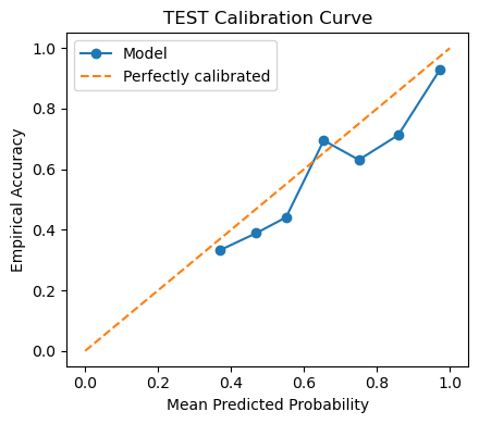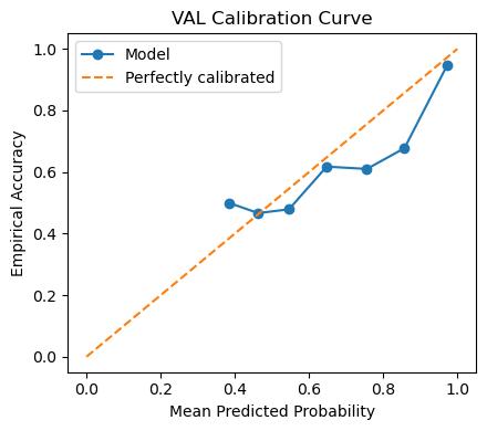 The reliability diagrams show slight under‑confidence in the mid‑range (≈ 0.4 – 0.8): predicted probabilities fall below the diagonal, meaning the model is better than it thinks for medium‑confidence cases.