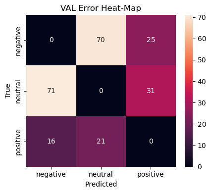def error_heatmap(m: dict, split: str) ->None: y_true, y_pred, _ = _get_arrays(m, split) n =len(INT2STR) err = np.zeros((n, n), dtype=int)for t, p inzip(y_true, y_pred):if t != p: err[t, p] +=1 fig, ax = plt.subplots(figsize=(4.5, 4)) sns.heatmap( err, annot=True, fmt="d", xticklabels=[INT2STR[i] for i inrange(n)], yticklabels=[INT2STR[i] for i inrange(n)], ax=ax, ) ax.set_xlabel("Predicted") ax.set_ylabel("True") ax.set_title(f"{split.upper()} Error Heat‑Map") plt.tight_layout() plt.savefig(FIGS_DIR /f"error_heat_{split}.png", dpi=150) plt.show()error_heatmap(metrics, "val")error_heatmap(metrics, "test")