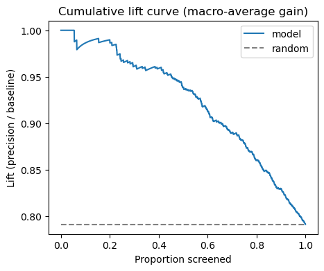 ax.set_title("Cumulative lift curve (macro‑average gain)" )