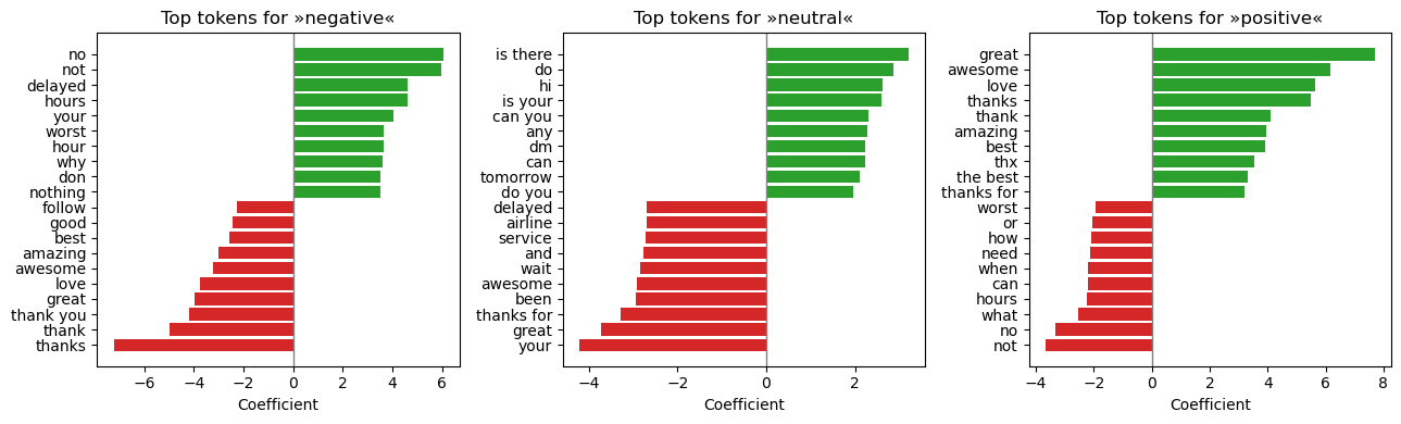 Positive coefficients (green) push predictions toward the class; negative coefficients (red) push away .