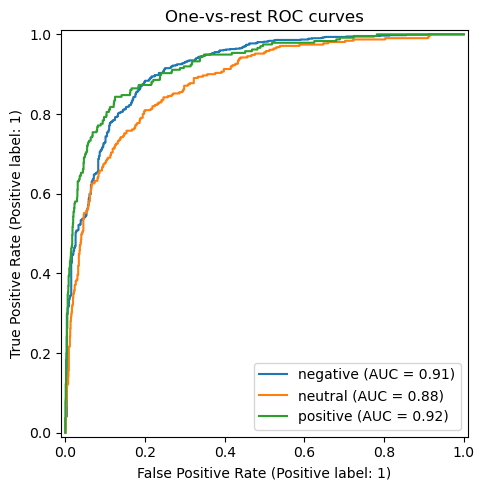 Performance: Accuracy 0.79 , macro‑F1 0.78 , macro AUC 0.91 —strong for a lightweight TF‑IDF + LogReg stack.
