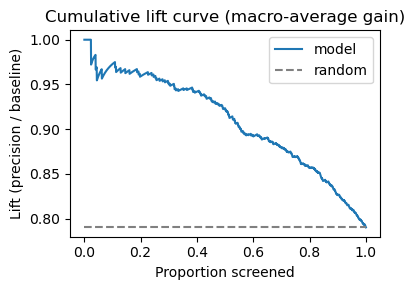 ax_lift.set_title("Cumulative lift curve (macro‑average gain)" )